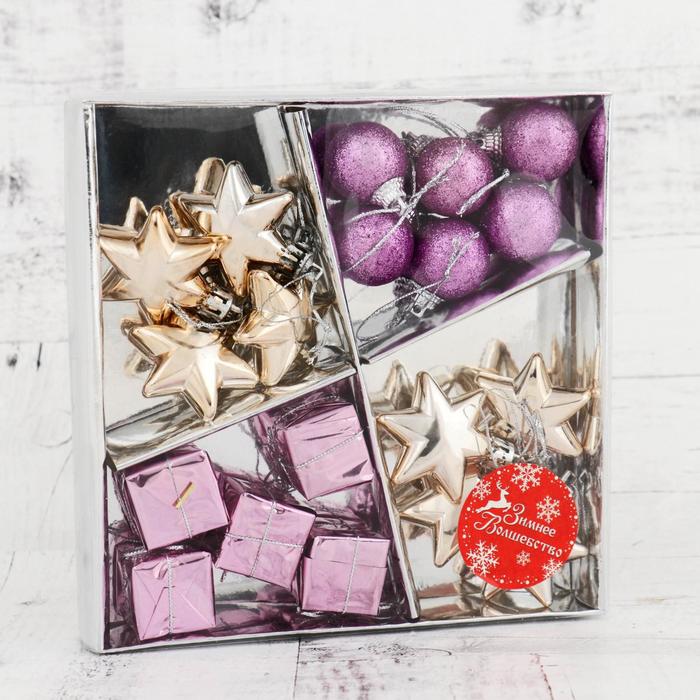Ёлочные игрушки «Фортуна», новогодние, набор 19 шт. (5 подарков, 6 шаров, 8 звёзд), сиреневый/золотистый — Характеристики