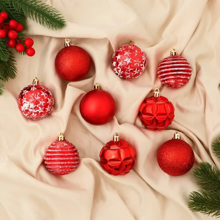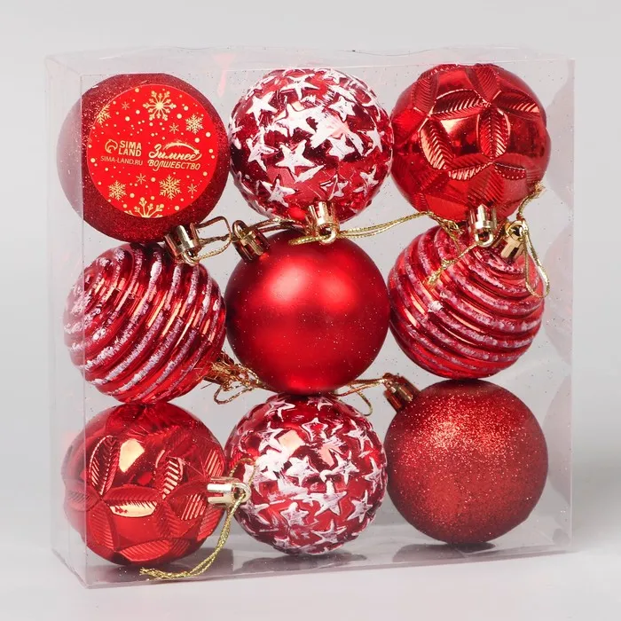 Ёлочные игрушки «Гармония», шары новогодние, d=5.5 см, набор 9 шт., звёзды, полоски, красно-белый — Характеристики