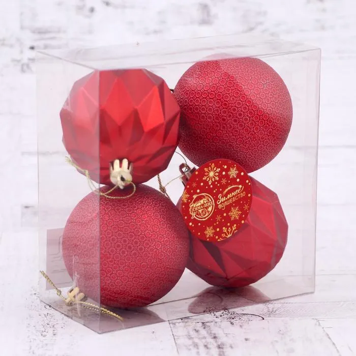 Новогодние шары насыщенного красного цвета — это стильный и лаконичный акцент для праздничной ёлки. Четыре пластиковые игрушки диаметром 7 см станут универсальным решением для создания тёплой и яркой атмосферы зимнего праздника. Их можно использовать как самостоятельные украшения или включать в более сложные композиции декора.