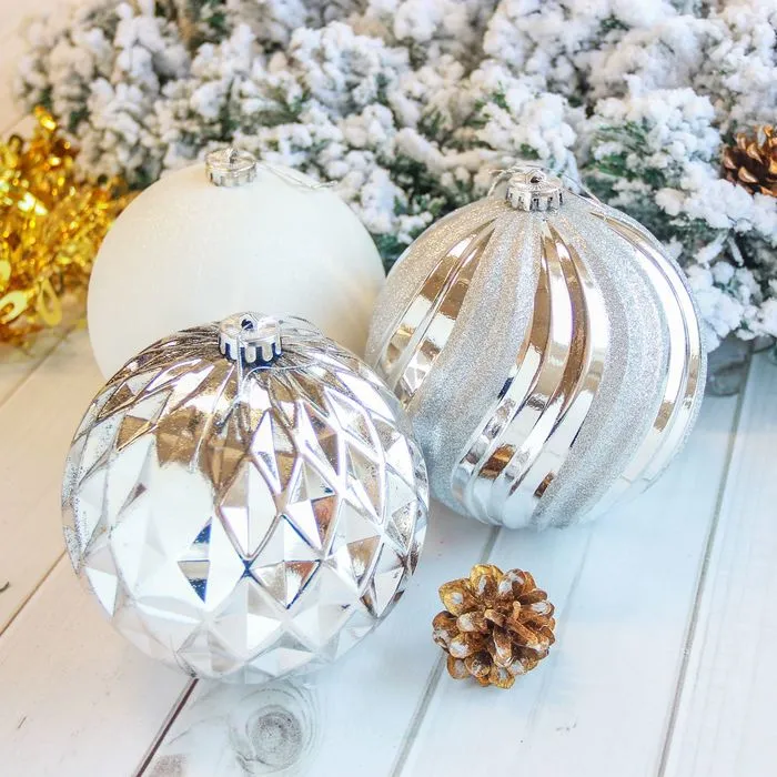 Большие серебристые шары — это яркий акцент для праздничного интерьера. Три пластиковых игрушки диаметром 15 см станут центральным элементом новогоднего декора. Они подходят под разные стили: от строгого ар-деко до уютного скандинавского дизайна. Такие украшения не теряются на фоне ёлки и привлекают внимание с первого взгляда.