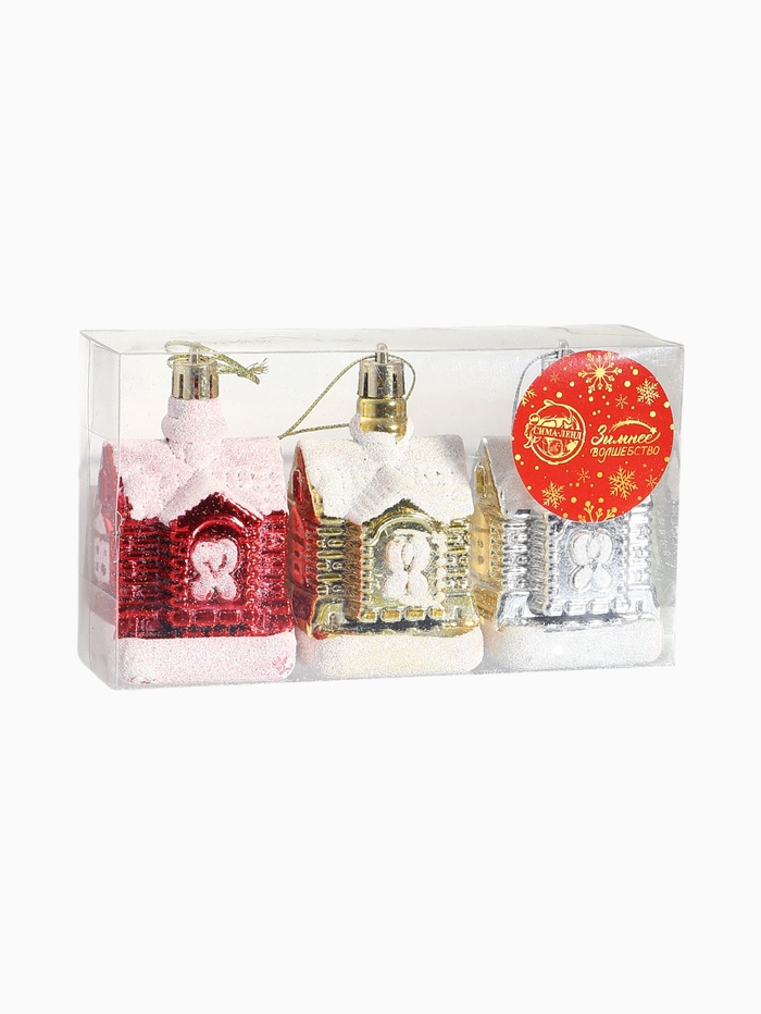 • В наборе три домика, что позволяет создать разнообразные композиции и украсить ёлку с разными акцентами.