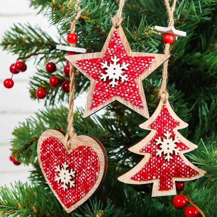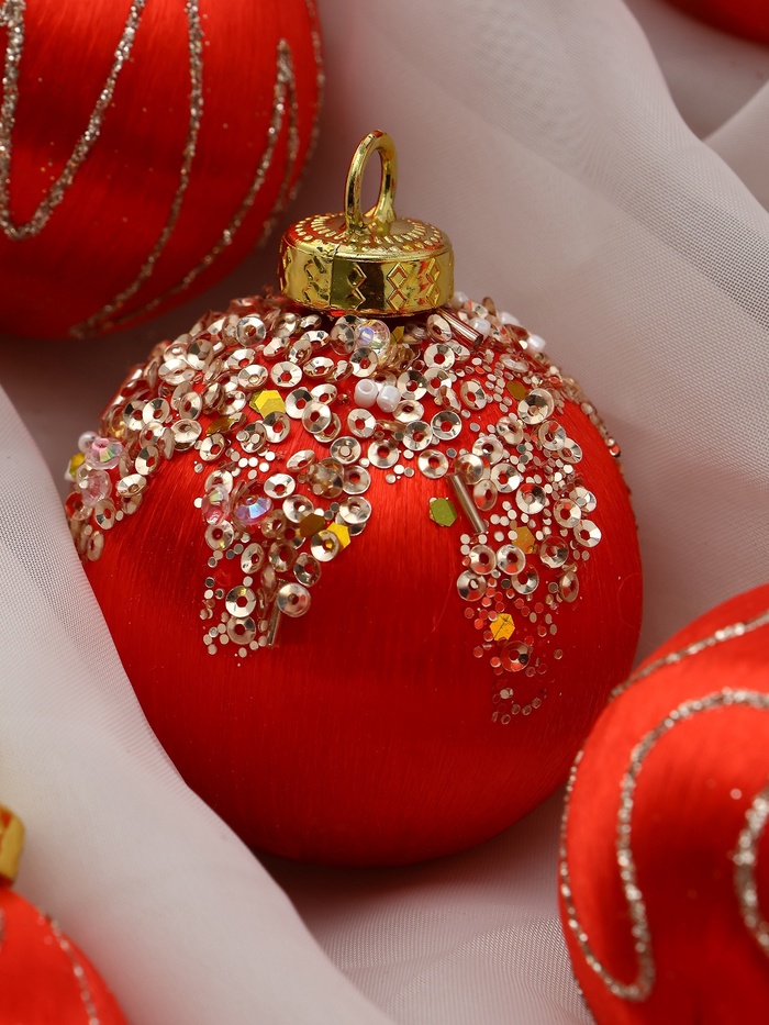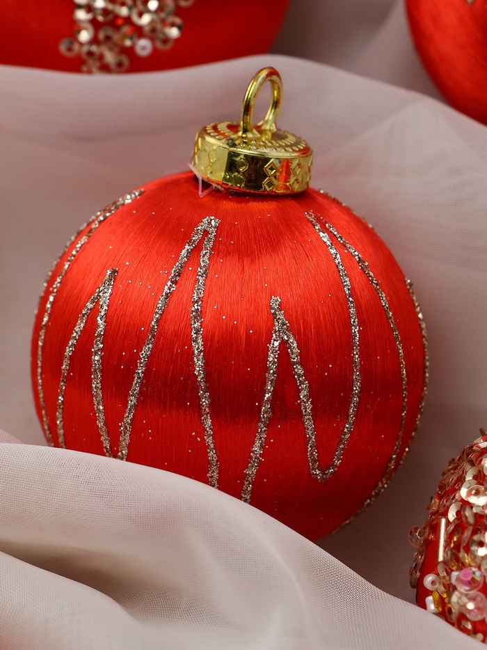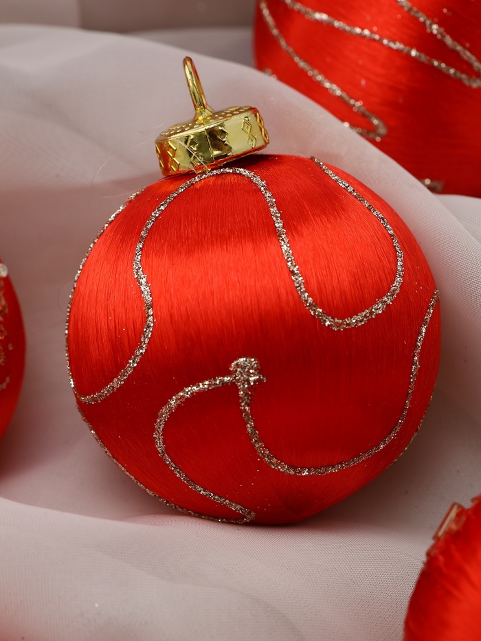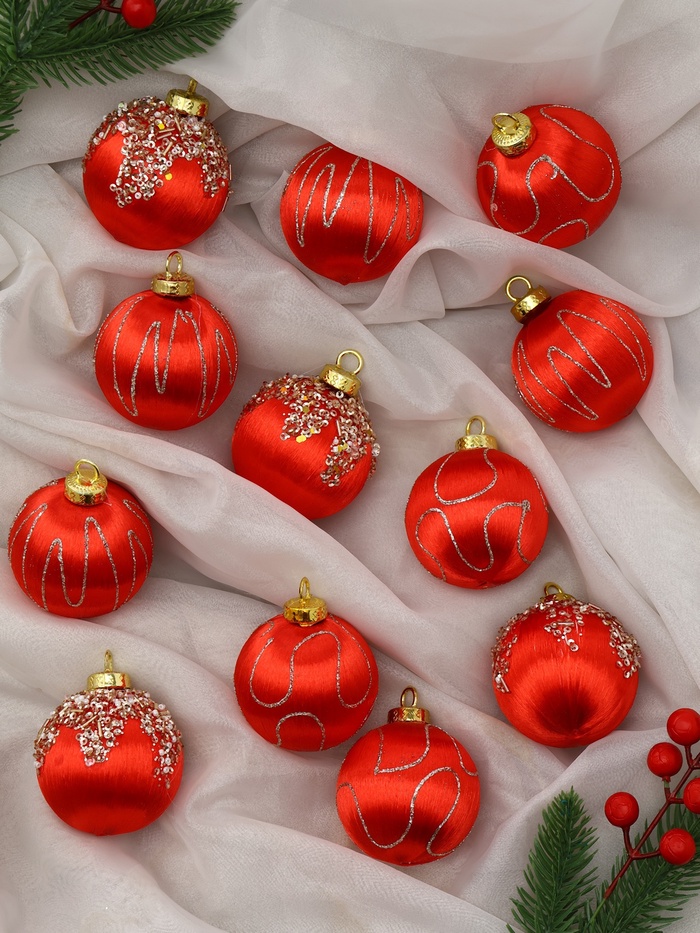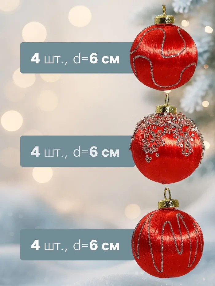 Набор из 12 красных ёлочных шаров диаметром 6 см с рисунком сочетает пластик и текстиль, создавая интересный тактильный эффект и разнообразие в праздничном декоре. Эти украшения помогут оформить ёлку в традиционном стиле с акцентом на насыщенный цвет и фактуру.