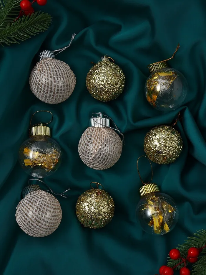 Набор из 9 золотистых ёлочных шаров диаметром 6 см с декоративным рисунком станет изящным дополнением к новогоднему оформлению. Пластиковые украшения сочетают лёгкость и прочность, обеспечивая удобство в использовании и хранении.