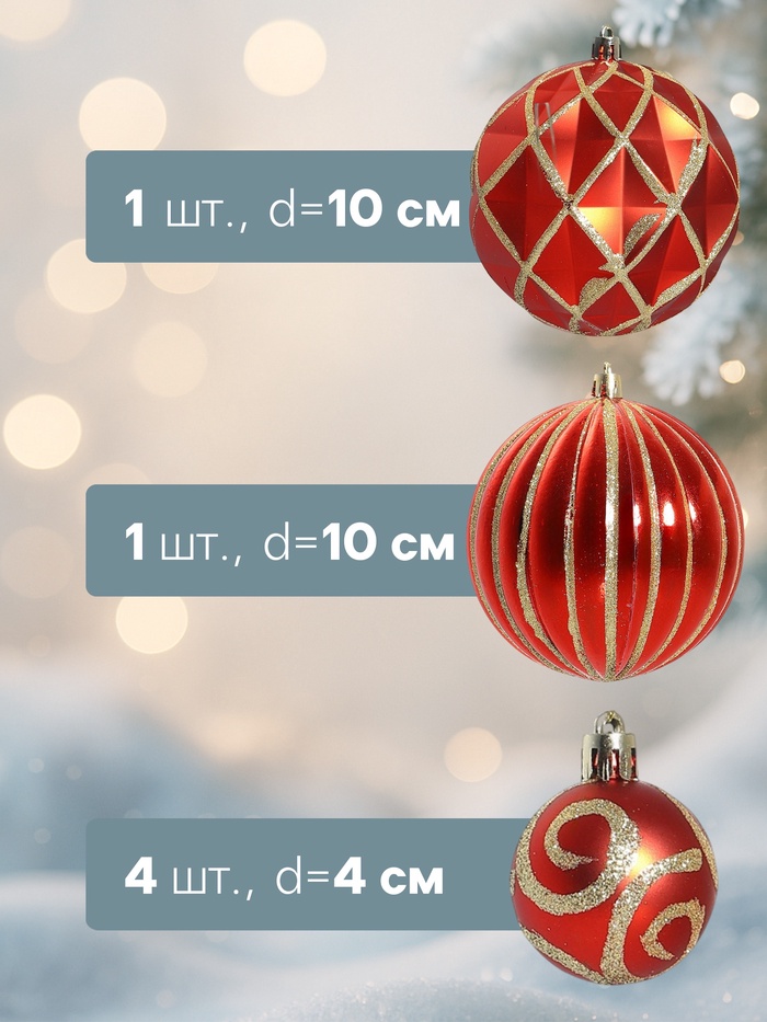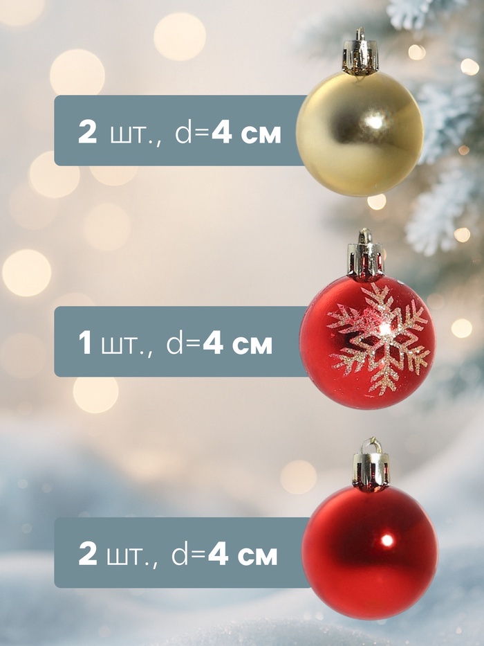 Эти ёлочные шары не просто украшения, а настоящие акценты, которые помогут вам создать волшебную атмосферу в вашем доме. Красный цвет символизирует радость и тепло, а золотые детали добавляют нотки роскоши и праздности. Такой набор идеально подойдёт для тех, кто хочет сделать свою ёлку центром внимания, привлекая взгляды и восхищение гостей.