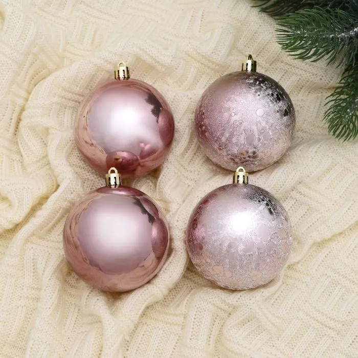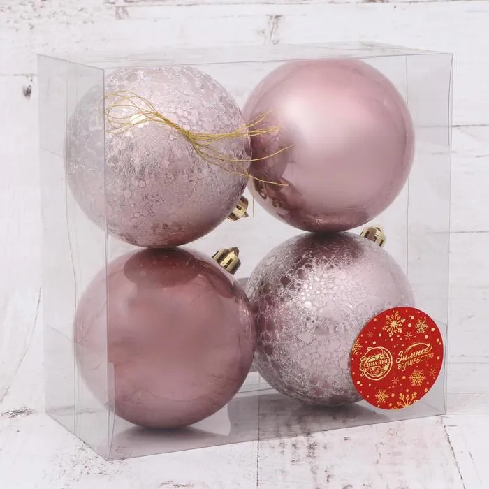Новогодние шары нежно-розового цвета — это изысканный акцент для праздничной ёлки в стиле шебби-шик. Четыре пластиковые игрушки диаметром 8 см станут мягким, но заметным элементом декора, добавляя интерьеру романтичности и уюта без излишней вычурности. Такие украшения идеально подходят для создания зимнего праздника с лёгким и светлым настроением.