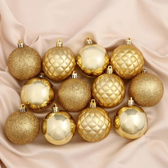 Пластиковые новогодние шары золотистого цвета — это универсальное решение для праздничного декора, созданное для тех, кто ценит свет и порядок в оформлении ёлки. Игрушки диаметром 6 см выполнены в классической форме и подходят под стили ар-деко, барокко и советского дизайна. Набор из 12 элементов идеально подходит для плотного украшения или как фоновое дополнение к уже существующей композиции.