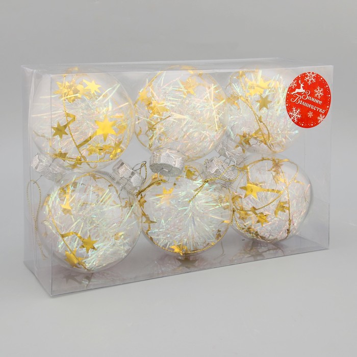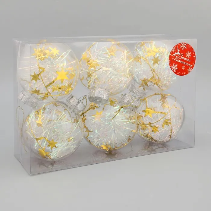 Прозрачные новогодние шары с наполнением «Льдинка — мишура» — это яркий акцент для праздничного декора. Набор из 6 пластиковых игрушек диаметром 8 см украшен золотистой мишурой внутри, которая мерцает в свете гирлянд. Такие украшения подойдут под стилистику новогоднего барокко и ар-деко, добавляя интерьеру блеска и торжественности без излишней пестроты.