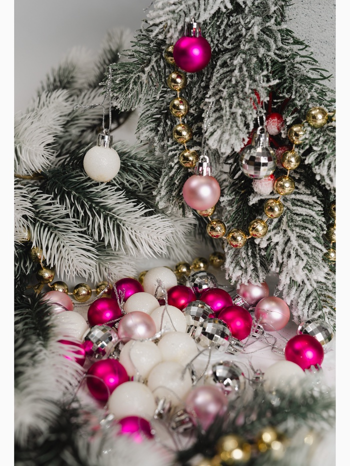 Эти шары создают образ зимнего торжества, где важны не блеск, а мягкие тона и равновесие деталей. Белые и розовые оттенки добавляют дереву света, но не нарушают общий стиль. Используйте игрушки как основу или как часть уже существующего декора — они одинаково хорошо работают в разных интерьерах и подходах к оформлению Нового года.