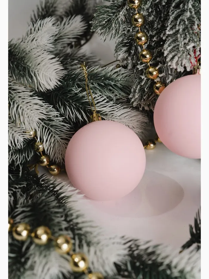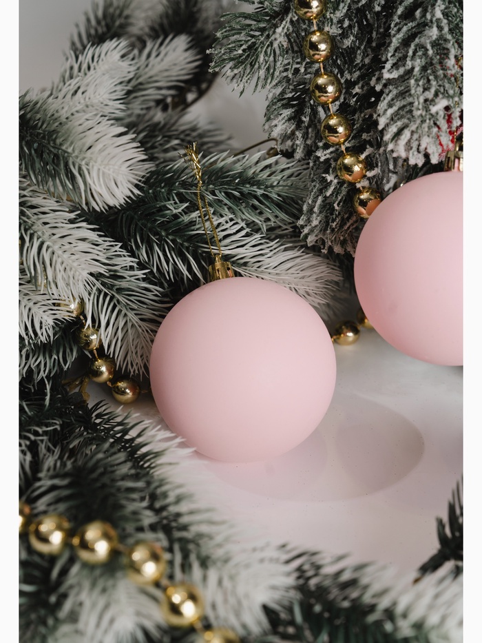 Эти украшения подойдут тем, кто предпочитает праздничный декор с характером и эстетикой. Розовый оттенок добавляет пространству тепла и света, а матовая поверхность делает образ более утончённым. Больший размер игрушек позволяет сделать акцент на деталях, не перегружая ёлку. Пластиковые шары сохраняют яркость и форму годами — практичное решение для стильного Нового года.