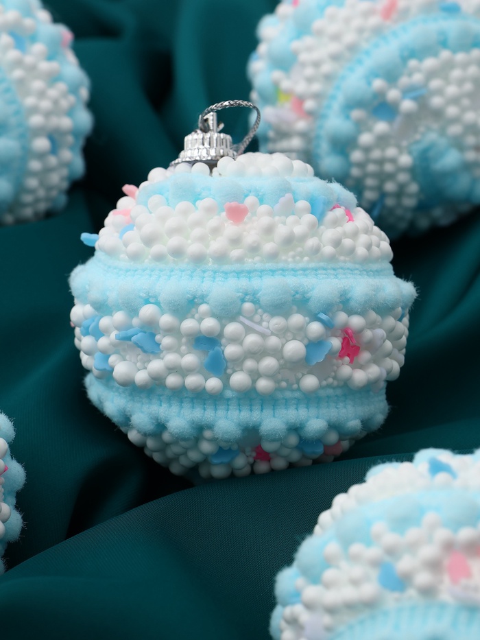Голубые шары с матовой фактурой гармонично сочетаются с другими украшениями, добавляя свежести и лёгкости. Они отражают свет гирлянд, наполняя пространство зимним спокойствием и праздничным настроением.