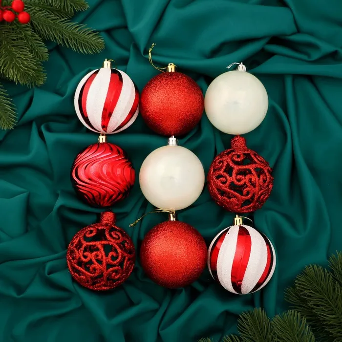 Новогодние шары с орнаментом — это праздничный декор для тех, кто ценит стиль и традиции. Набор из 9 пластиковых игрушек диаметром 8 см оформлен в бело-красной гамме с рисунком в виде полос. Игрушки частично выполнены в однотонном стиле, другие — с резным узором. Решение подойдёт как для скандинавского, так и для фьюжн-интерьера.