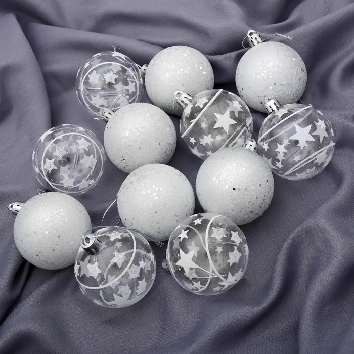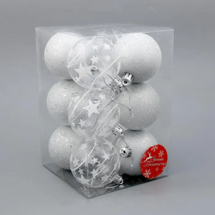 Белые новогодние шары с рисунком — это сочетание зимней сказки и современного дизайна. Набор из 12 пластиковых игрушек диаметром 6 см украшен узорами, вдохновлёнными звёздным светом и зимним небом. Такие украшения подходят для классического, скандинавского, датского и ар-деко стиля. Они добавляют праздничному интерьеру глубину, текстуру и лёгкую магию без излишней пестроты.