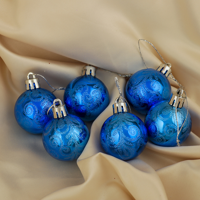 Шесть синих шаров диаметром 4 см создают лаконичное украшение для новогодней ёлки. Их глубокий оттенок напоминает о зимних сумерках, а небольшой размер делает набор универсальным для декора. Пластиковые шары с рисунком сохраняют лёгкость и подходят для украшения как больших ёлок, так и компактных композиций.