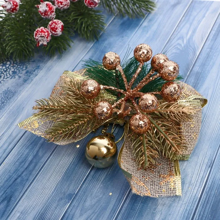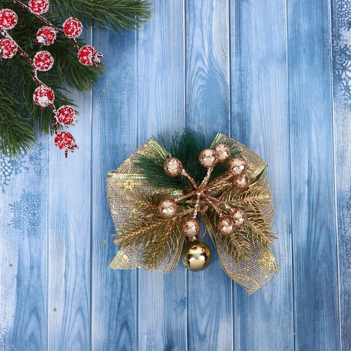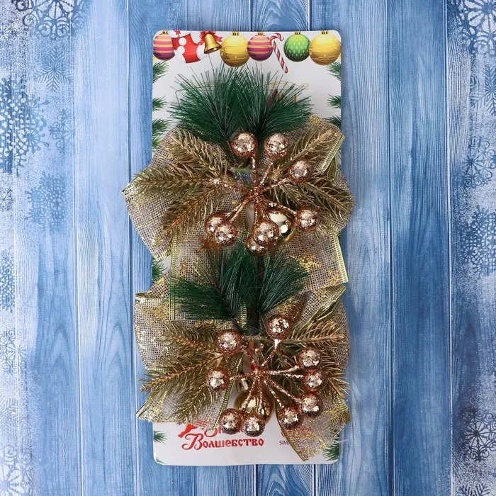 Ёлочные игрушки набор 2 шт. «Зимнее волшебство. Еловая композиция» пластик, бант с принтом, 13х12 см, золото — Характеристики