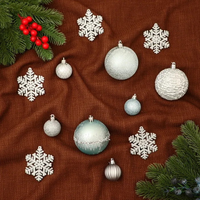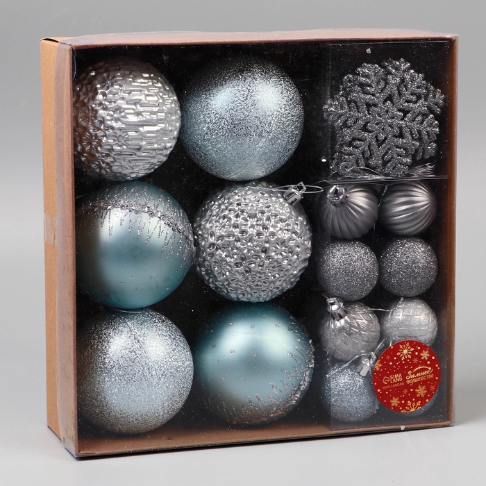 Ёлочные игрушки, набор 30 шт., «Торжество», d=7 и 3.5 см, снежинка-6.5 см, серебро/голубой — Характеристики