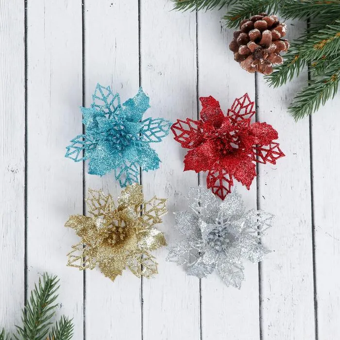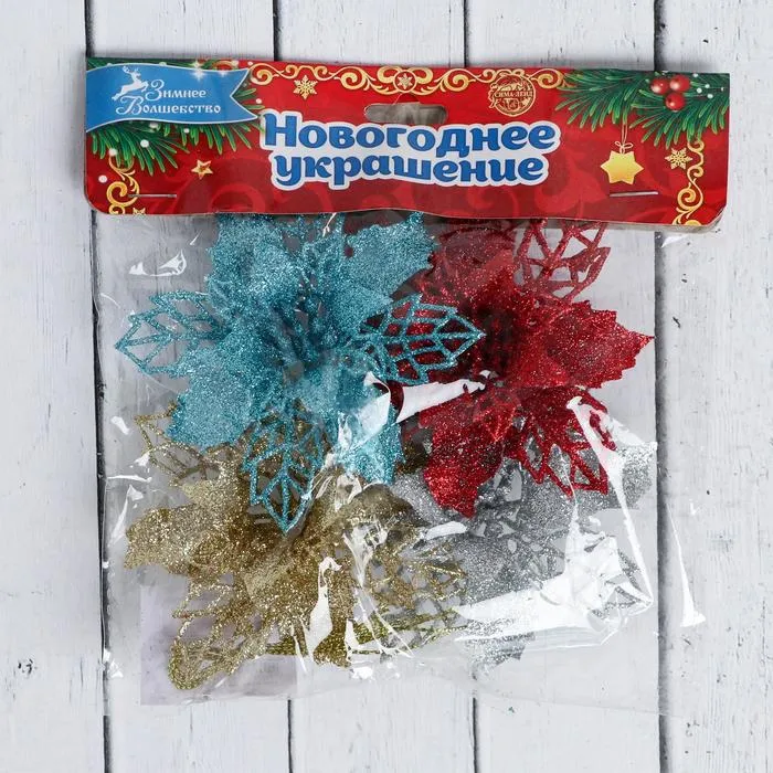Ёлочные игрушки, набор 4 шт. «Зимнее волшебство. Цветы ажурные - блеск», пластик, 8х8 см, МИКС — Характеристики