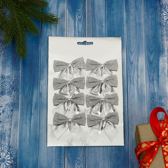 Ёлочные игрушки, набор 8 шт, «Зимнее волшебство. Бантик с блеском» пластик, 4,5х5,5 см, серебро преобразят новогоднюю ель, также ими можно украсить и любые другие предметы. Сделайте праздничное убранство сияющим!
