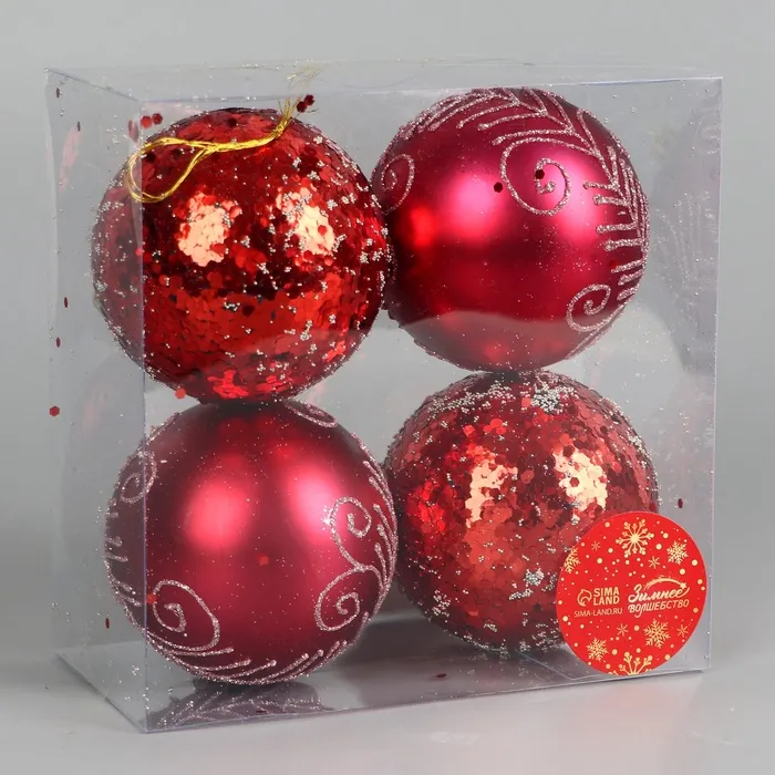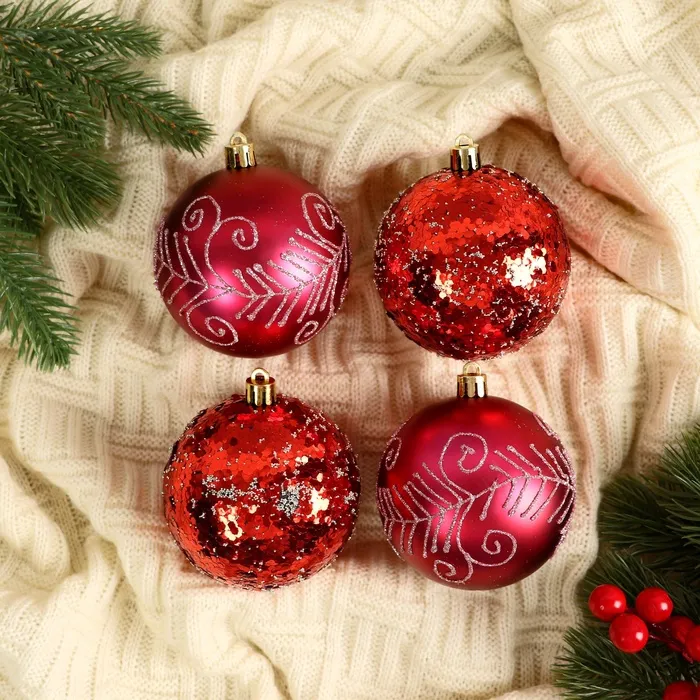 Ёлочные игрушки «Ночка», шары новогодние, d=8 см, набор 4 шт., узоры, красный — Характеристики
