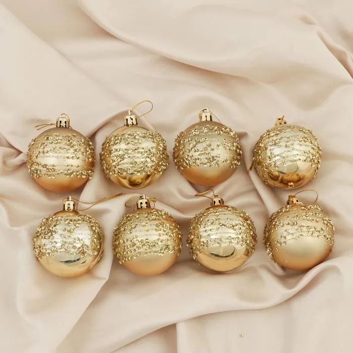 Пластиковые новогодние шары золотистого цвета с рисунком — это изысканное дополнение к праздничному декору для тех, кто ценит свет и детали в оформлении ёлки. Игрушки диаметром 6 см выполнены в классической форме и украшены узором, что добавляет им индивидуальности. Набор из 8 элементов подходит под стили барокко, ар-деко и строгой классики и станет ярким акцентом без пафоса.