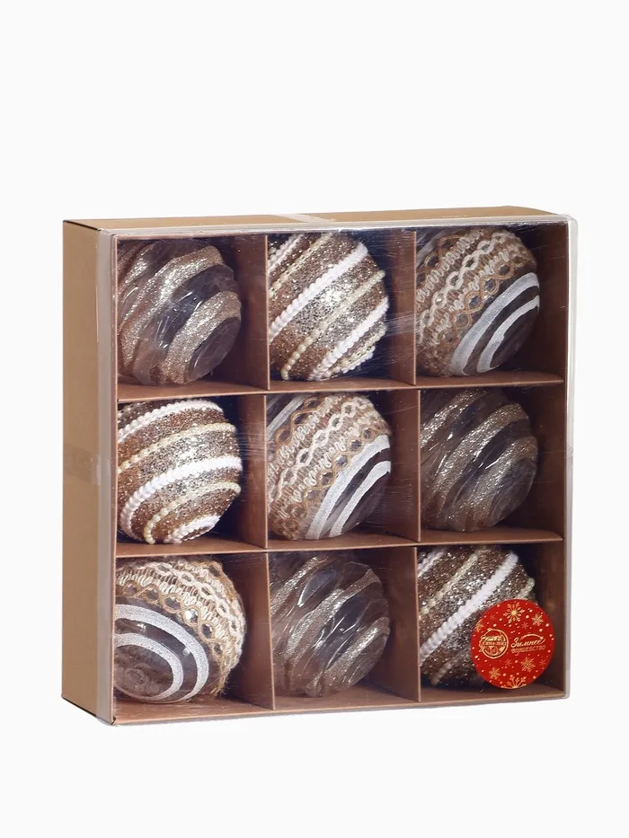 Набор из 9 золотистых ёлочных шаров диаметром 8 см с изящным рисунком. Эти пластиковые украшения добавляют тепла и праздничного блеска в новогодний интерьер.