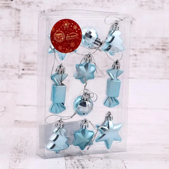 Ёлочные игрушки пластик 10 шт "Сюрприз" (4 звезды, 2 конфеты, 2 ёлки, 2 шара-4 см) голубой — Характеристики