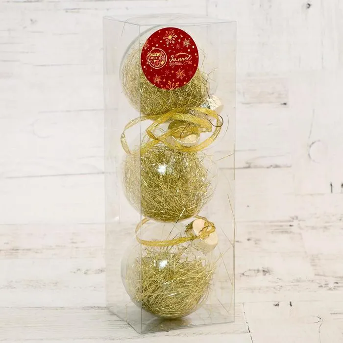 Новогодние шары «Праздничное настроение» — это три золотистых украшения диаметром 8 см с прозрачными вставками и внутренним наполнением. Их дизайн сочетает классические линии, барочную роскошь и строгость ар-деко. Такие игрушки станут заметным, но уместным акцентом на ёлке, подчеркнёт торжественность момента и создаст ощущение праздника.