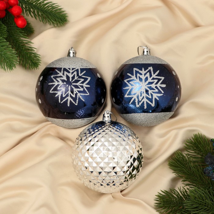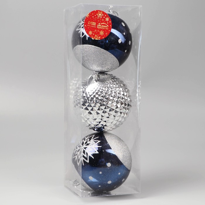 Ёлочные игрушки «Праздничные узоры», шары новогодние, d=10 см, набор 3 шт., снежинка, серебристо-синий — Характеристики
