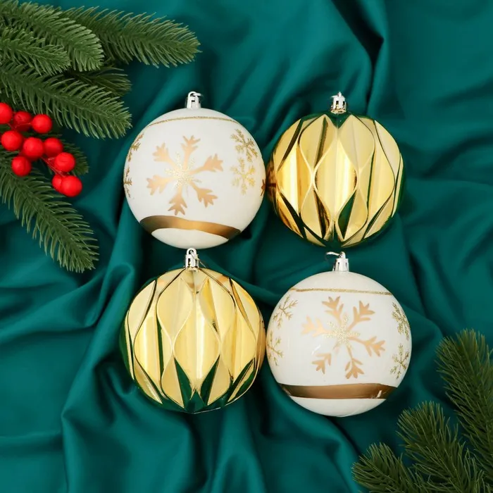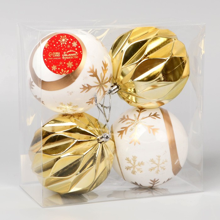 Ёлочные игрушки «Праздничные узоры», шары новогодние, d=10 см, набор 4 шт., грани, золотисто-белый — Характеристики