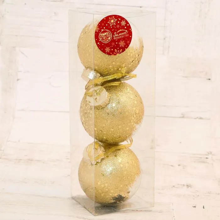 Новогодние шары «Праздничный блеск» — это три золотистых украшения диаметром 8 см, выполненных в стиле ар-деко и новогоднего барокко. Прозрачные вставки добавляют лёгкости, а однотонное покрытие подчёркивает элегантность. Эти игрушки станут достойным акцентом на любой праздничной ёлке и создадут атмосферу торжества без излишней вычурности.