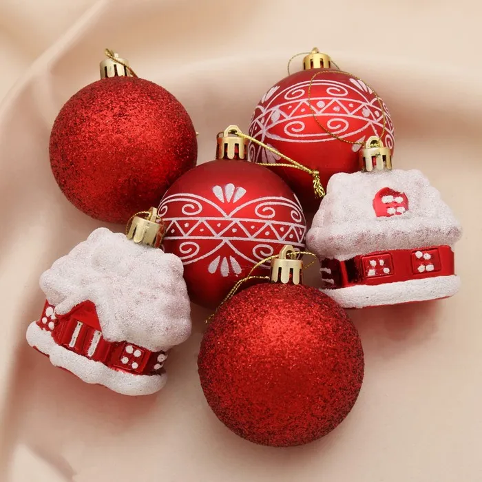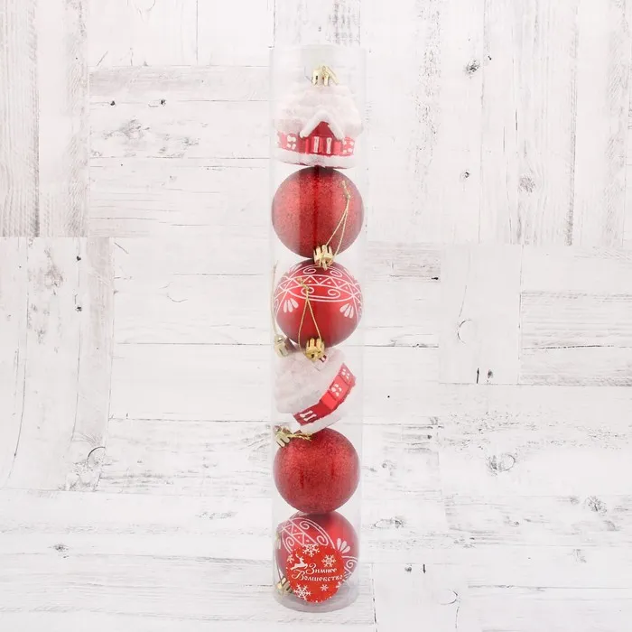 Ёлочные игрушки «Праздник», шары новогодние, набор 6 шт. (4 шара, 2 домика) 6 см, красный — Характеристики