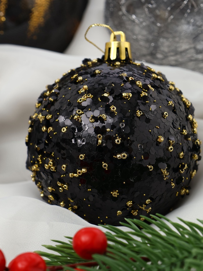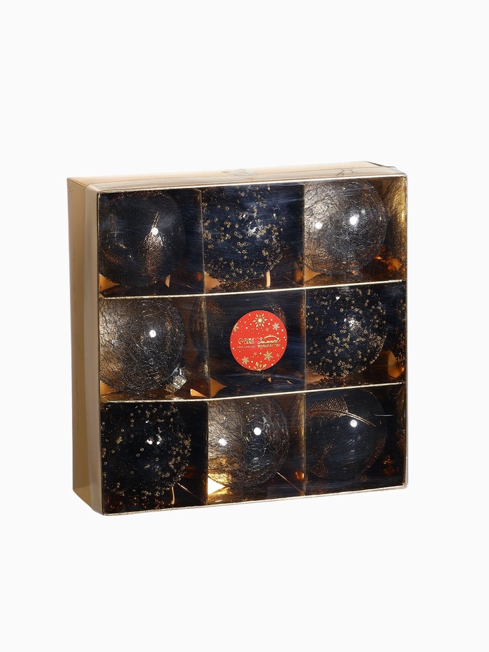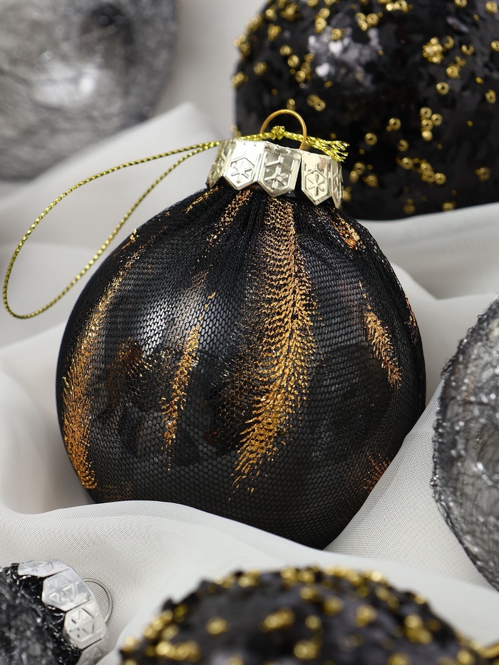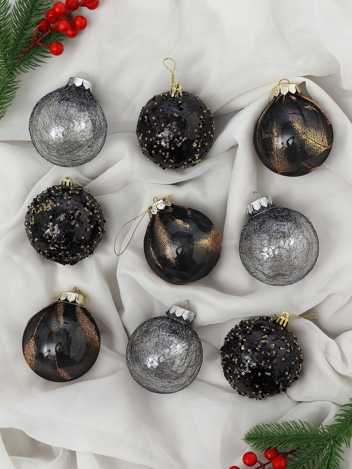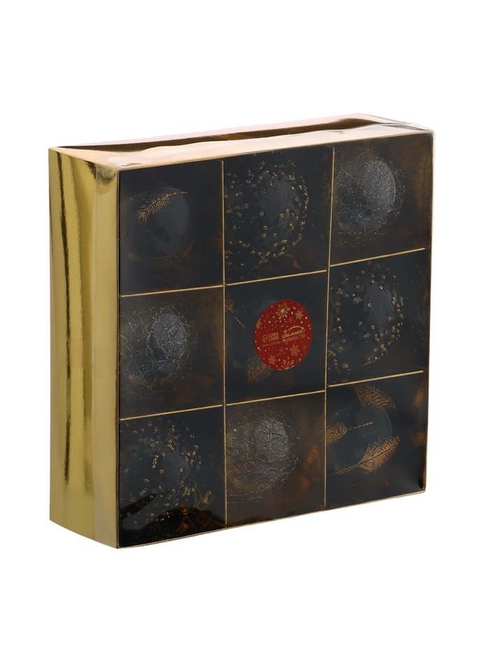Набор из 9 чёрных ёлочных шаров диаметром 8 см с рисунком в виде перьев. Пластиковые украшения добавляют глубину и изящество в праздничный декор, подчёркивая стиль и элегантность новогодней ёлки.
