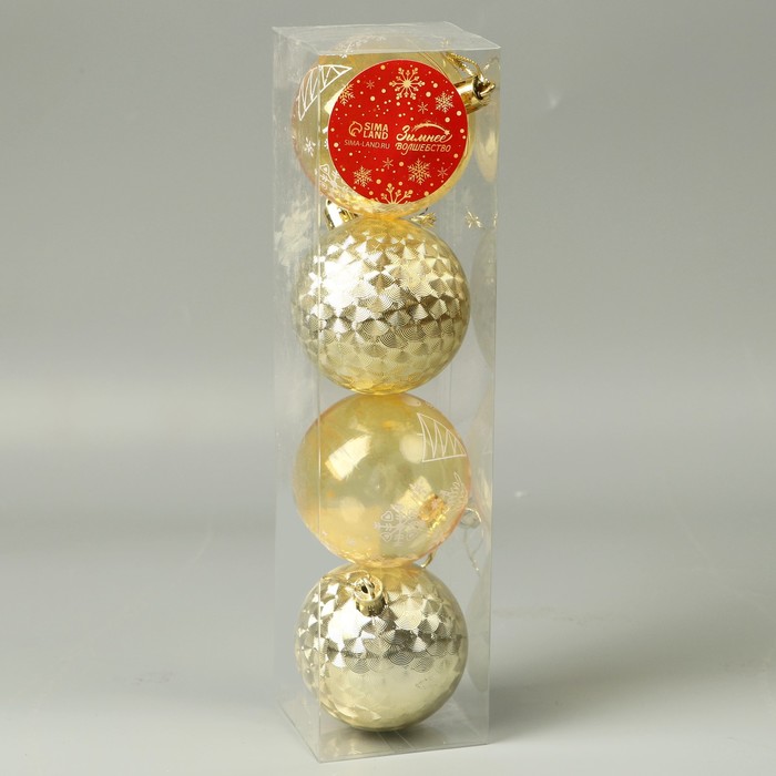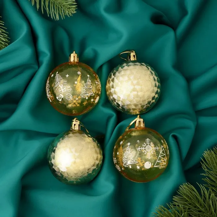 Ёлочные игрушки, шары новогодние , пластик, набор d-5,5 см, 4 шт "Новогодние забавы" геометрия снежинки, золото жёлтый — Характеристики