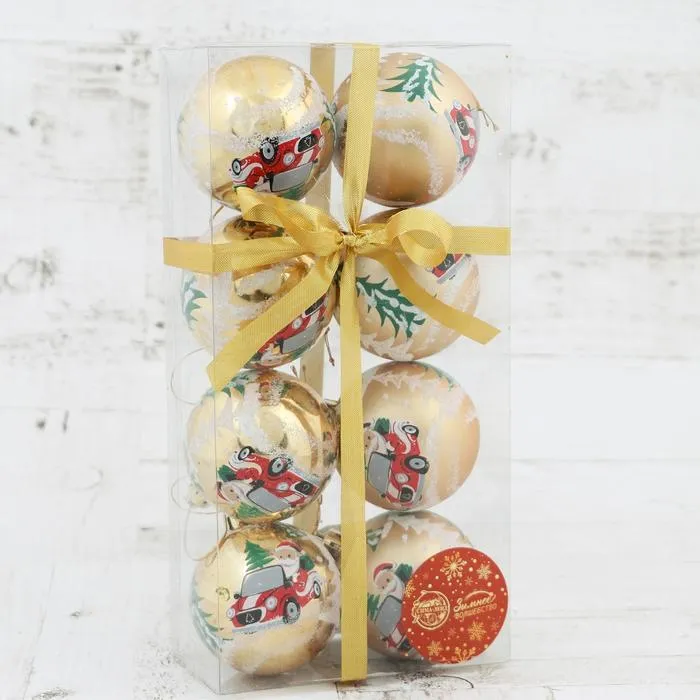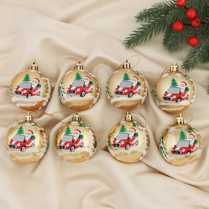 Ёлочные игрушки, шары новогодние , пластик, набор d-6 см, 8 шт "Дед Мороз на автомобиле" золото — Характеристики
