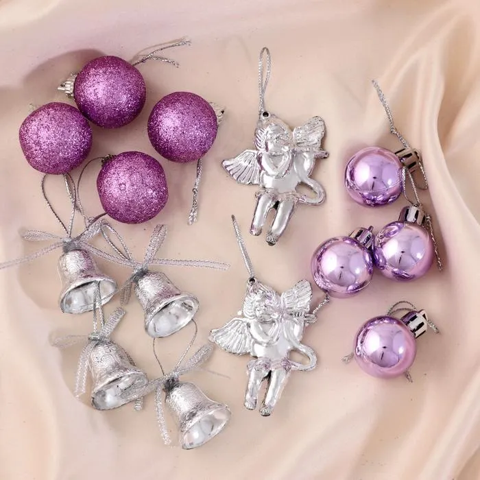 Ёлочные игрушки «Сюрприз», шары новогодние, набор 14 шт. (4 колокольчика, 8 шаров, 2 ангела), фиолетовый — Характеристики