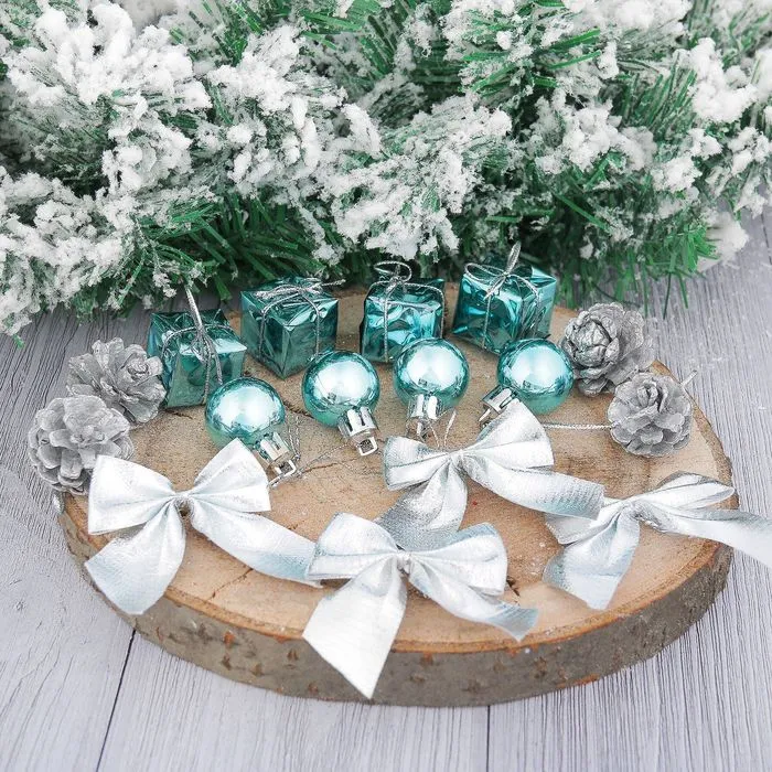 Новогодние игрушки «Сюрприз» — это разнообразный и лаконичный набор для украшения ёлки в серебристо-голубой гамме. В комплекте 16 элементов: шары, банты, подарки и шишки диаметром 3 см с однотонной поверхностью. Украшения выполнены из пластика и текстиля, оформлены в стиле шебби-шик, что делает их универсальным решением для создания уютного и праздничного дизайна.