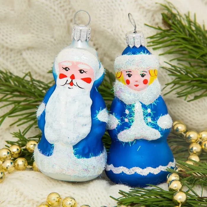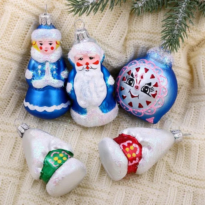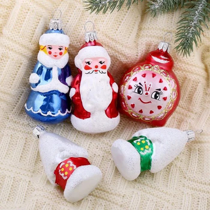 Новогодние ёлочные игрушки «Сказочный набор» — это доброжелательный и стильный акцент для украшения праздничной ёлки. В комплекте 5 стеклянных игрушек разной формы: Дед Мороз, Снегурочка, домик, часы и другие элементы зимней сказки. Украшения выполнены в разноцветной палитре с рисунком и оформлены в духе советского дизайна и фьюжн-стиля. Это решение для тех, кто хочет создать атмосферу Нового года с теплом, историей и светом.