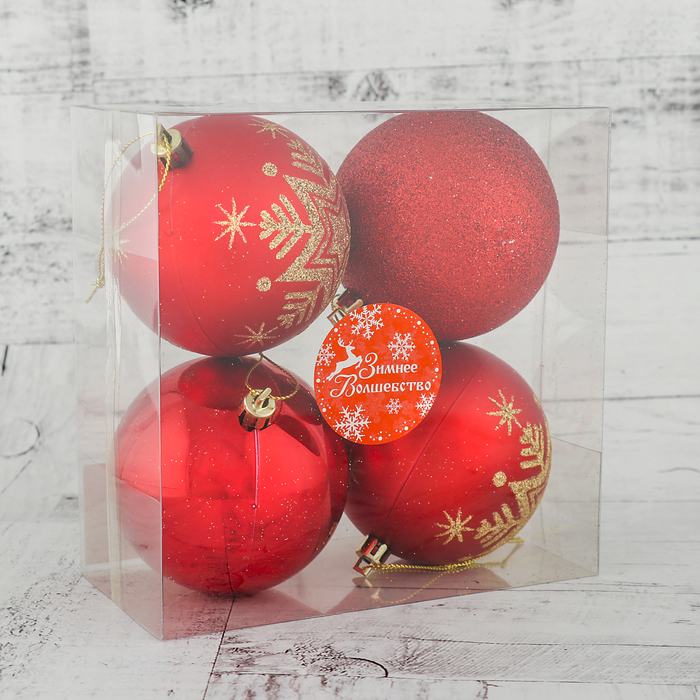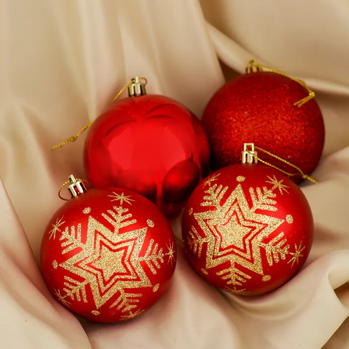 Новогодние шары красного цвета, 8 см в диаметре, набор из 4 штук — это яркий и запоминающийся акцент для праздничной ёлки. Игрушки с рисунком добавляют декору индивидуальности и делают образ ёлки более нарядным. Эти украшения подходят под разные стили: от «новогоднего барокко» до советской новогодней классики.