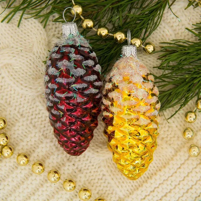 - Форма — шишка, образ природы и семейного тепла на новогодней ёлке.