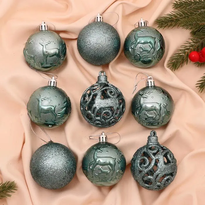 Набор из девяти зелёных ёлочных шаров диаметром 6 см выполнен в однотонном дизайне, объединяющем датский минимализм, скандинавскую простоту и шебби-шик. Лёгкий пластик обеспечивает удобство размещения и долговечность украшений в праздничном интерьере.