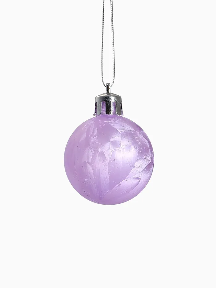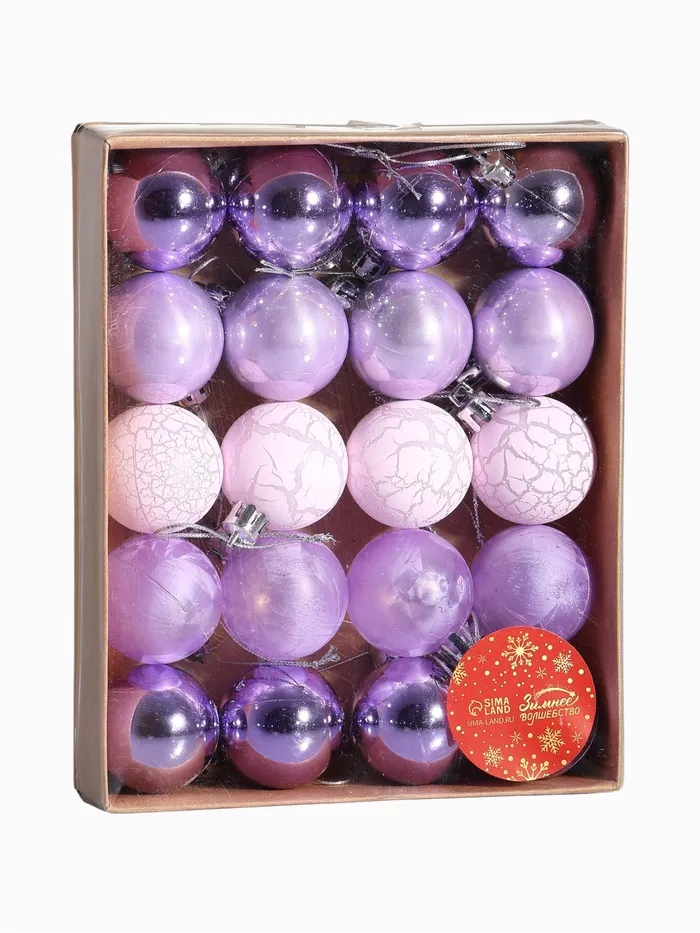 Набор из 20 сиреневых ёлочных шаров диаметром 4 см в стиле шебби-шик. Однотонные пластиковые украшения с нежным рисунком создают спокойную и уютную атмосферу для новогоднего декора.