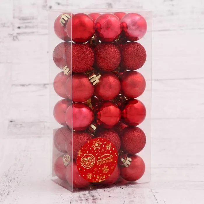 Новогодние шары красного цвета, 3 см в диаметре, набор из 36 штук — практичный и яркий выбор для украшения ёлки. Насыщенный оттенок и компактные размеры позволяют создать плотный, но аккуратный декор. Эти игрушки подходят под разные стили: от «новогоднего барокко» до скандинавского минимализма.