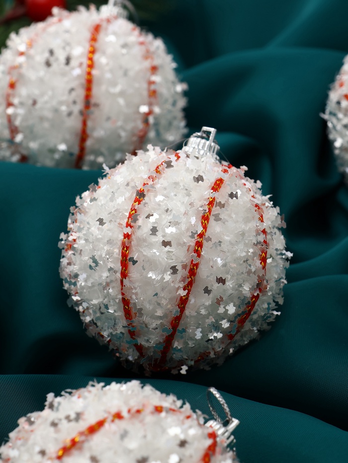 Белые шары отражают огни гирлянд и создают ощущение зимней свежести. Их дизайн помогает сделать ёлку светлой и воздушной, подчёркивая атмосферу новогоднего праздника.
