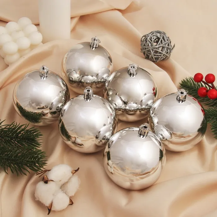 Ёлочные игрушки «Винтажный глянец», шары новогодние, набор 6 шт., d=8 см, серебристый очаровательно смотрятся с новогодними игрушками в виде бантов и цветов. Превратите новогодний интерьер в серебристую сказку.