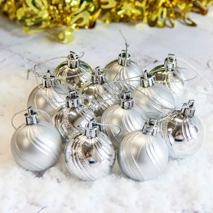 Серебристые новогодние шары — это универсальное украшение для праздничной ёлки. Набор из 12 пластиковых игрушек диаметром 4 см подходит под разные стили оформления: от строгого ар-деко до уютного скандинавского дизайна. Такие шары станут ярким акцентом в декоре без лишней вычурности.