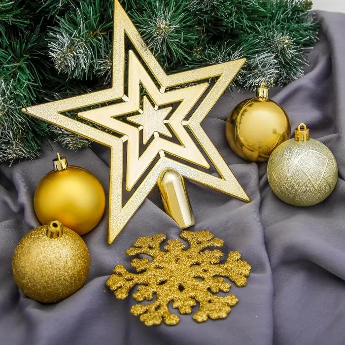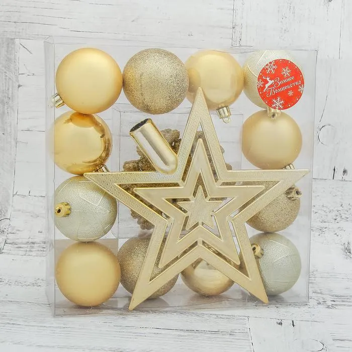 Наполните дом атмосферой оптимизма и благополучия в канун Нового года. Ведь золотой цвет символизирует изобилие и богатство. Потому ёлочные игрушки «Вспышка», со звездой, пластиковые, набор 17 шт., золотистый как нельзя лучше подойдут для праздничного интерьера.