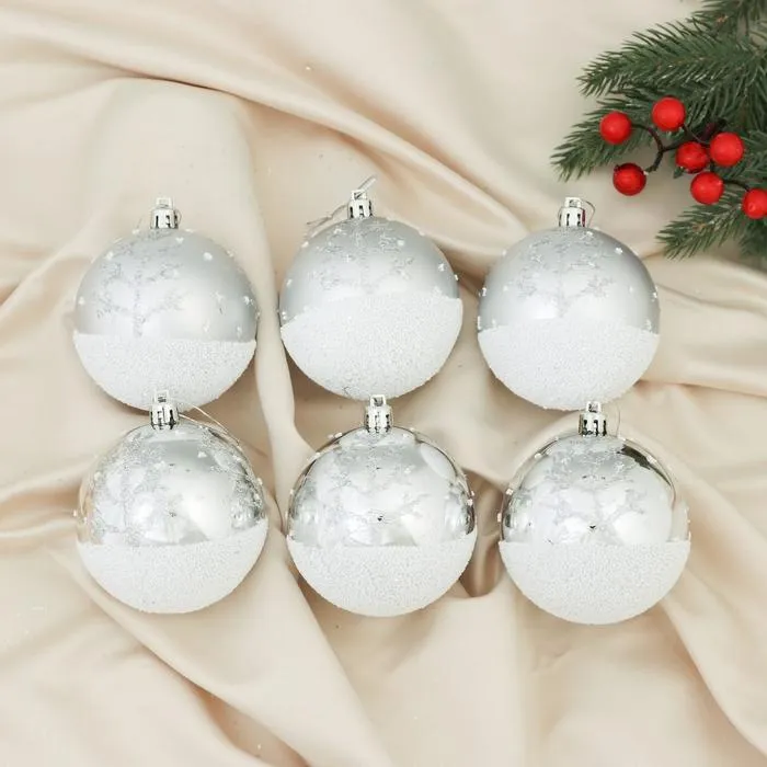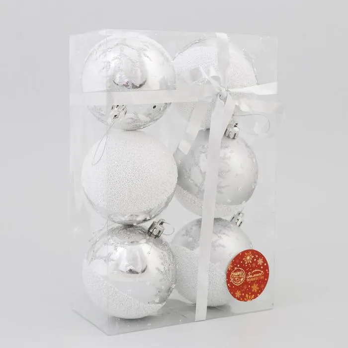 Новогодние шары «Заснеженный лес» — это зимняя атмосфера в ярко выраженных акцентах. Набор из 6 пластиковых игрушек диаметром 8 см украшен рисунком, вдохновлённым узорами снега и инея. Такие украшения подойдут для создания праздничного декора в стиле ар-деко, скандинавского минимализма или датского дизайна. Лаконичный рисунок добавляет интерьеру настроения без лишней вычурности.