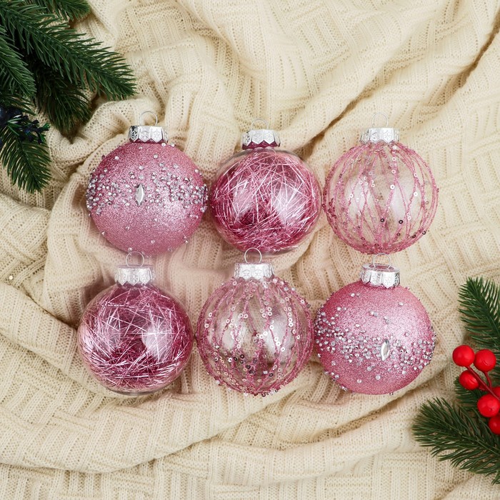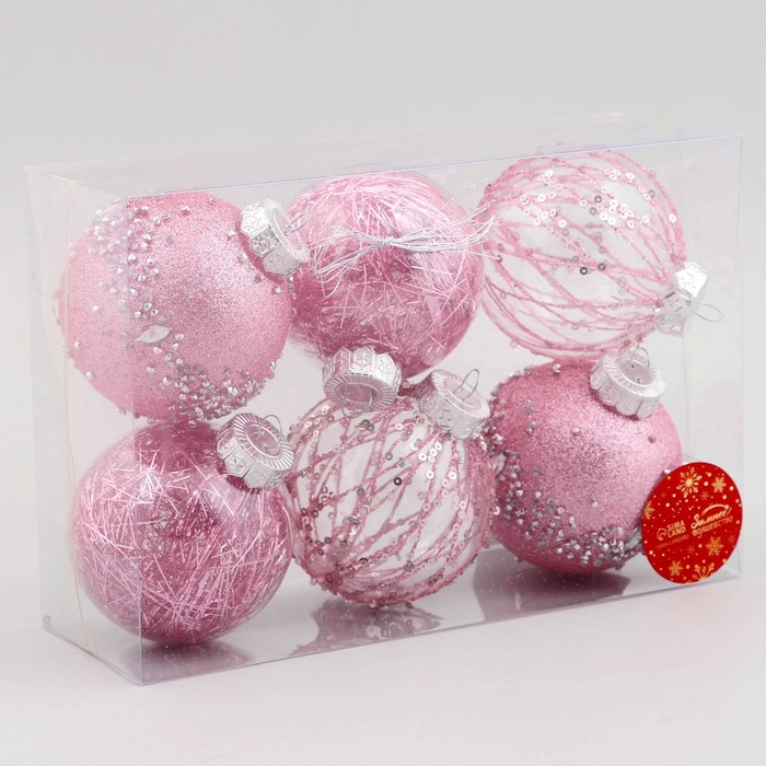 Новогодние шары розового и прозрачного оттенков — это изысканный акцент для праздничной ёлки в стиле шебби-шик. Шесть пластиковых игрушек диаметром 8 см с рисунком станут мягким, но заметным элементом декора. Подходят для создания уютной и романтичной атмосферы зимнего торжества без излишней вычурности.