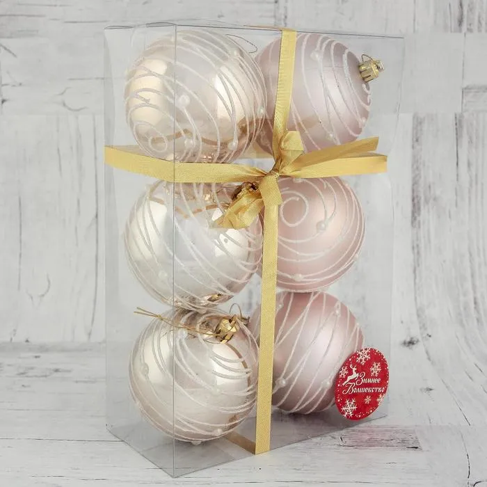 Новогодние шары «Жемчужный орион» — это праздничный декор для тех, кто ценит изысканность и светлые оттенки в оформлении ёлки. Набор включает 6 пластиковых игрушек диаметром 8 см в розово-золотистой гамме с рисунком, выполненных в стиле новогоднего барокко, ар-деко и шебби-шик. Это решение для создания зимнего торжества с акцентом на элегантность и уют.
