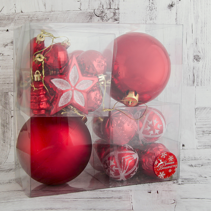 Размеры: шары 11 см, 6 см, 4,5 см и 3 см, звезда 7 см, сосулька 12 х 2 см, ёлочка 6 х 3 см, гриб 6 х 5 см, леденец 9 х 5 см.