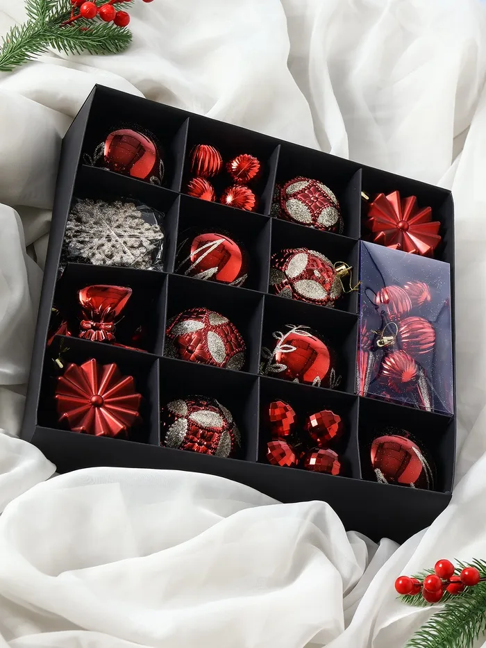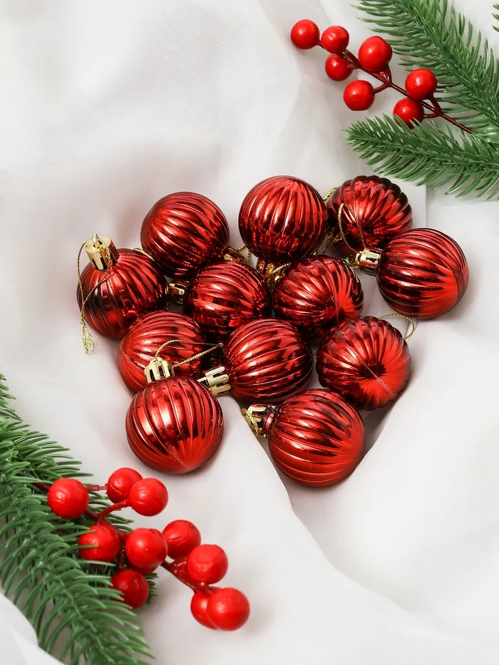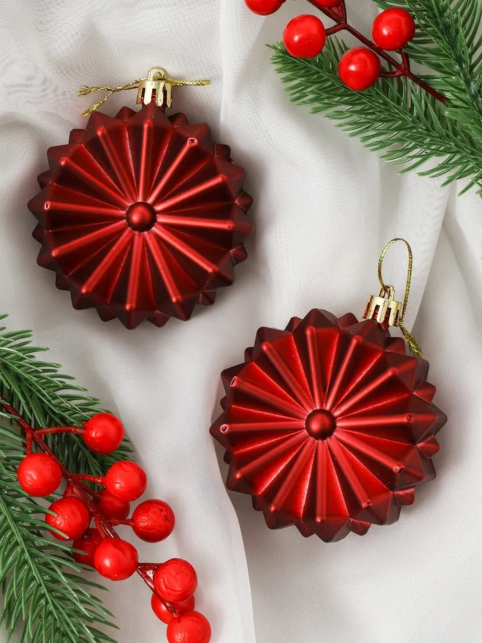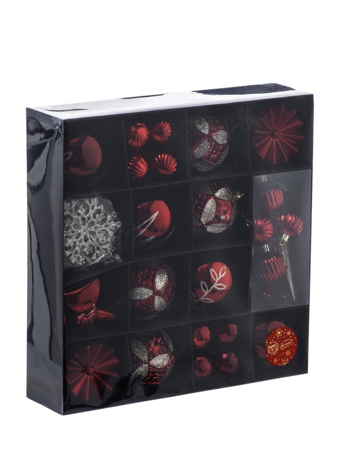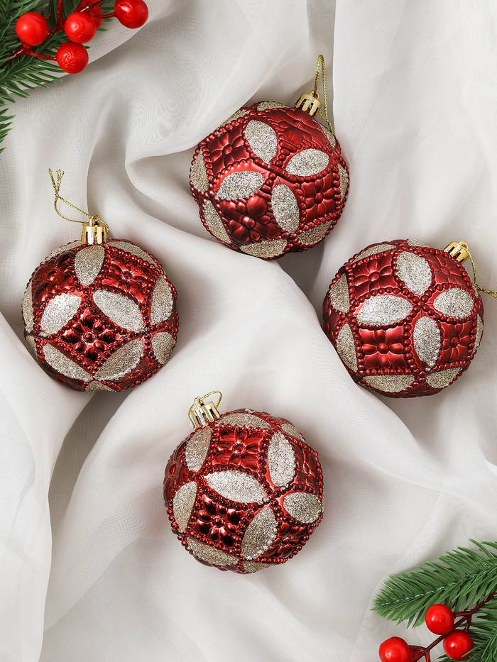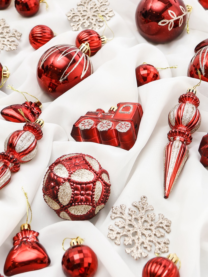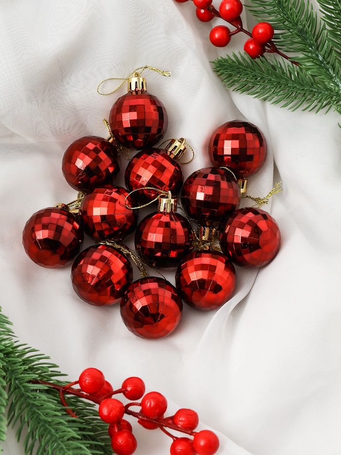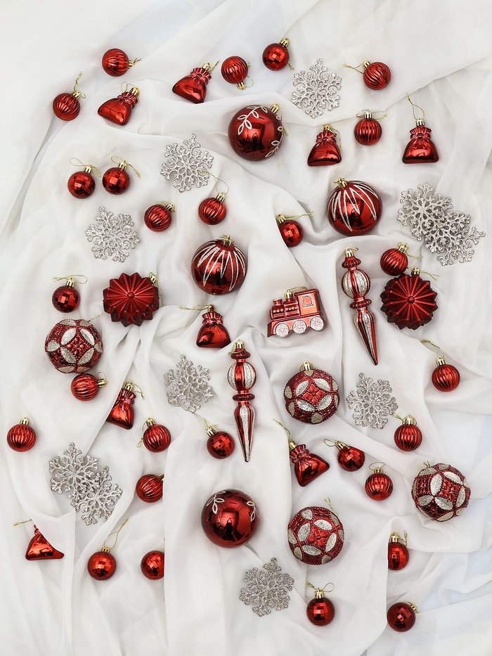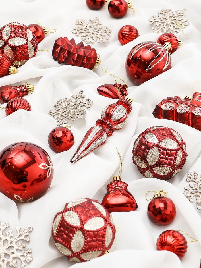 Набор из 60 красных пластиковых ёлочных украшений с разнообразными рисунками станет ярким акцентом в праздничном оформлении. Комплект подходит для создания насыщенного и сочного новогоднего декора, подчёркивая традиционный цвет праздника.